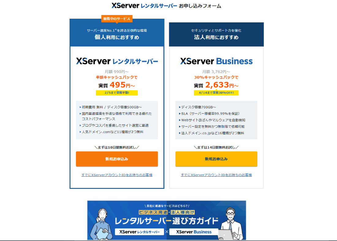 ─ エックスサーバーでドメインを無料で管理したい場合、「.co.jp」などの一部ドメインはビジネスプランを選ぶ必要があります。