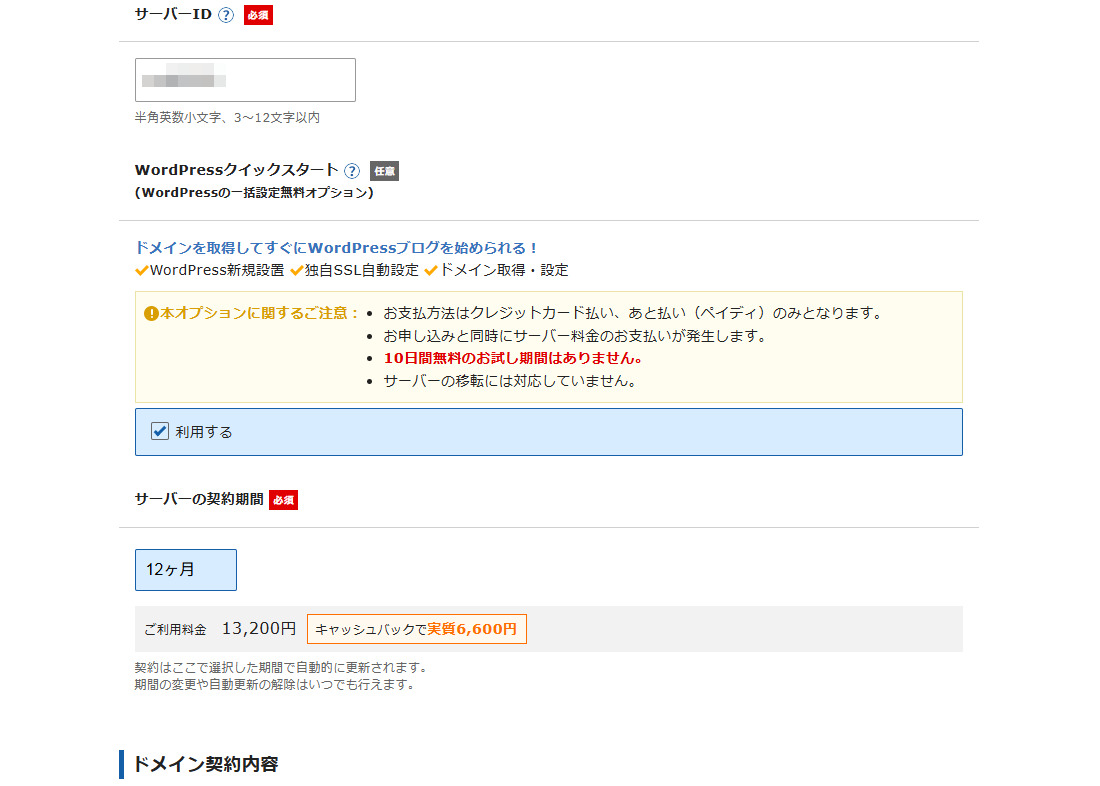 (※画像は12か月以上の契約で半額キャッシュバックキャンペーンて適用されています。) - WordPressクイックスタート:WordPressをすぐに始めたい人は、同画面の「WordPressクイックスタート」の項目にチェックを入れる。