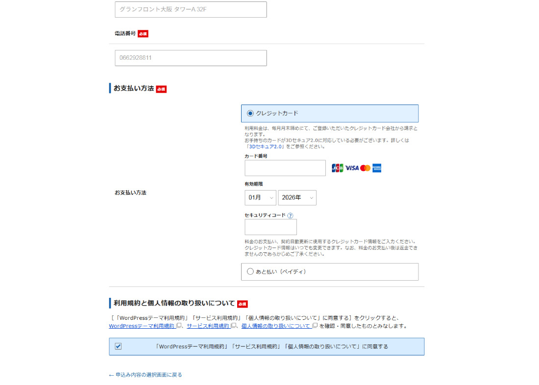 プランやドメイン・WordPress情報を入力したら、お客様情報の入力後、クレジットカード情報などの支払い情報を入力し、申込み内容を確認してから確定します。